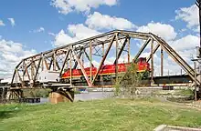 A PTRA train in 2016, crossing one of two surviving swing bridges over Buffalo Bayou in Houston