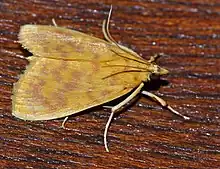 Adult Portentomorphini are relatively small moths with a forewing length of 7.5–9.5 mm (0.30–0.37 in),[3] or a wingspan of 20–29 mm (0.79–1.14 in).[4] The forewing maculation is usually of a yellow colour, but often exhibits a distinctively red or orange postmedial (outer) area. The tribe is characterised by a number of synapomorphies, particularly in the morphology of the genitalia. The male genitalia are rather unique among Pyraustinae and Crambidae in general in having the costa detached from the valva and projecting freely in a dorsal direction, with the apex bearing a field of setae. The valva mostly is reduced to the large, membranous sacculus, which reaches far out and ends in a setose field. A thin and elongate, often articulated fibula of curved shape emerges from the centre of the dorsal valva edge, reaching in a dorsal direction. The narrow uncus without setae is often forked at its tip. In the female genitalia, the appendix bursae, a membranous pouch, emerges at the anterior end of the ductus bursae, close to where it transitions into the corpus bursae; in Pioneabathra, however, it is laterally attached to the corpus bursae. The signum, a sclerotised structure in the corpus bursae, varies in shape among the members of Portentomorphini: a four-armed star in Hyalobathra and Cryptosara, an elongate ovoid sclerite in Portentomorpha, or two large, opposing granulose areas in Pioneabathra and Isocentris filalis.[1]