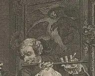 Only one artist seems to have shown the Prussian king as he really was, namely with an extremely clear aquiline nose and playing the flute in front of a symbol of homosexuality: William Hogarth in scene 4 of his satirical series Marriage A-la-Mode. The picture is entitled The Toilette and was completed in 1744. Art historian Bernd Krysmanski argues that Hogarth must have learned about Frederick's facial features from the Prussian engraver Georg Friedrich Schmidt whom he had visited in Paris in 1743 while seeking engravers for the engraved version of Marriage A-la-Mode.[117][107] The features of the flautist depicted on the left of Hogarth's painting[118][119] bear a striking resemblance to the death mask of Frederick,[120] as does the face of the flautist in Simon François Ravenet's reversed engraving after Hogarth's painting (1745).[121]