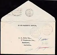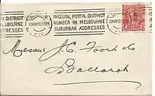 Postal district numbers for the addressing and sorting of mail were used in the suburban area of Melbourne, Victoria, Australia from February 1928[1] until their 1967 replacement by the Australia-wide postcodes. They were based on the London codes with a letter (or letters) denoting the direction from the main city post office and a number appended to, generally, correlate with the relative distance. An earlier system from around 1923 with twelve districts or 54[1][2] which had failed due to neglect was replaced.