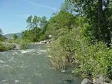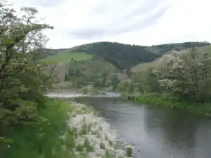 The Potlatch River is in the state of Idaho in the United States.[2] About 56 miles (90 km) long, it is the lowermost major tributary to the Clearwater River, a tributary of the Snake River that is in turn a tributary of the Columbia River.[3] Once surrounded by arid grasslands of the Columbia Plateau adjacent to the western foothills of the Rocky Mountains, the Potlatch today is used mainly for agriculture and irrigation purposes.