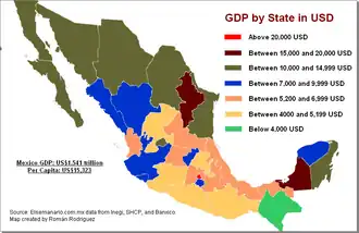 Historically, southern states like Chiapas, Oaxaca, and Guerrero have remained segregated from the rest of the country.[31] Their implementation of infrastructure, social development, education, and economic growth has been poorly accounted for. These states hold the highest levels of illiteracy, unemployment, lack of basic services such as running water and sanitation, overall urban infrastructure, and government establishment.[32] As citizens of the least fortunate states have noticed growth and improvements in other states, many have simply left seeking better opportunities.[33]