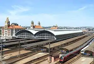 The Art Nouveau station building and station hall were built between 1901 and 1909, designed by Czech architect Josef Fanta on the site of the old dismantled Neo-Renaissance station designed by Czech architects Antonín Viktor Barvitius and Vojtěch Ignác Ullmann.[5]