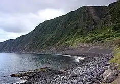 A fajã is the term used to define a small extension of land, located along the ocean, formed from rock debris or a volcanic delta from lava meeting the ocean. The bay in Fajã is protected cove, sheltered by steep arriba covered in Laurasilva forest, that developed from the historic eruption of Cabeço do Fogo (1672-1673).[5] The geological formation and the existence of a micro-climate allows human habitation, making it an ideal destination for tourists and local summer homes, as well as the adega wine cellars.[5] A small beach, from which the name Praia do Norte originates, provides an area of activities along its several metres of dark sand areal during the summer.[5] But, the beach is primarily popular with surfers, since offshore conditions allow for large waves throughout the year. The eastern portion of the parish is a tall and abrupt cliff that is connected to Cedros plateau.[5]