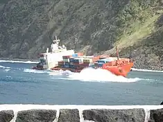 On December 9, 2005 while attempting to navigate to calm waters in the Bay of Praia do Fajã, the container vessel CP Valour, a Bermudan-registered ship, originally traveling between Montreal, Quebec, Canada and Valencia, Spain, ran aground 300 metres (980 ft) from the coast. It was transporting 800 containers, of which three were environmentally hazardous, and the vessel was filled with two thousand tons of fuel oil. The tugboats "São Luís" (from the port of Horta) and "São Miguel" (from the port of Ponta Delgada) were called out to assist the crippled vessel, and were later aided by the Russian tug "Fortiy Frilov" (in order to stabilize the ship in northerly swells). However, the bay's currents forced the ship further to shore, forcing the abandonment of the ship on 25 December. The hulls eventually breached, causing an oil spill into the bay and onto the beach at Fajã. Similarly, some containers containing toxic fire retardant, flammable ink and paint and sodium persulphate were affected, and several containers were damaged or destroyed during the incident, leaking their contents into the bay. In the report on the accident,[4] the Marine Accident Investigation Branch noted several failures including lack of crew management and procedures on the part of the operator, the inexperience and lack of seamanship of the master, and lack of proper nautical charts and anchoring experience. The accident brought world attention to Fajã da Praia, Faial and the Azores.