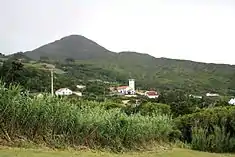 A view of the parochial church under the green cone of Cabeço do Fogo, that destroyed many homes in 1672