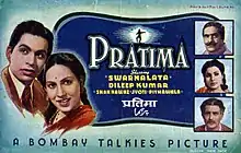 Pratima is a 1945 Indian Hindustani-language movie directed by Paidi Jairaj. The film was produced by Bombay Talkies and was the directorial debut of P. Jairaj.[1] The film stars Dilip Kumar, Swaran Lata, Mumtaz Ali, Shah Nawaz and Mukri. Swarn Lata was cast following her big success the preceding year, Rattan (1944). Mukri was cast in his debut role by Devika Rani, who is stated to have "liked his smile and off-screen enthusiasm".[2] The music direction was by Arun Kumar Mukherjee and the lyricist was Narendra Sharma.[3]