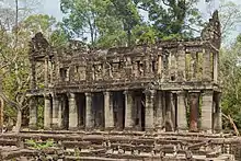 Preah Khan (Khmer: ប្រាសាទព្រះខ័ន; "Royal Sword") is a temple at Angkor, Cambodia, built in the 12th century for King Jayavarman VII to honor his father.[1]: 383–384, 389 [2]: 174–176 It is located northeast of Angkor Thom and just west of the Jayatataka baray, with which it was associated. It was the centre of a substantial organisation, with almost 100,000 officials and servants. The temple is flat in design, with a basic plan of successive rectangular galleries around a Buddhist sanctuary complicated by Hindu satellite temples and numerous later additions. Like the nearby Ta Prohm, Preah Khan has been left largely unrestored, with numerous trees and other vegetation growing among the ruins.