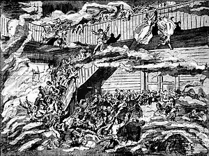 ![]() ![]() Top to bottom: Artist's drawing of members of the Holyoke Fire Department attempting to extinguish the fire, while fireman John T. Lynch pulls people from the front door; the panic inside the sanctuary as parishioners attempt to escape | |