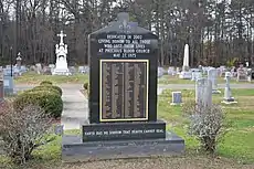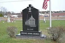 The cemetery is on Willimansett Street Extension near the intersection of Routes 33 and 202 in South Hadley. There is a monument for the dead at the church cemetery. The parish priest was also reburied there. The black memorial is in the center of the cemetery and the priest is buried behind that.