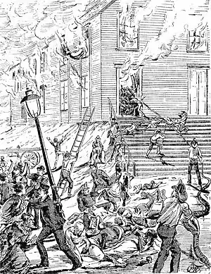 Precious Blood Church of Holyoke, Massachusetts, burned on May 27, 1875, killing 78 people. There was a crush of people through the entrance at the back left and many people could not leave. It is one of the deadliest fires in American history, and was also known by newspapers domestic and foreign as "The Holyoke Disaster".[2]