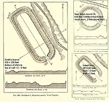 Loup Creek wall, "Trees of all sizes and varieties may be seen growing up through the heaps of loose stones which were once built into the wall. One of these which I particularly noticed was a red oak fully three feet in diameter and not less than four hundred years old. This would indicate that the wall had been abandoned at least that long if not longer. The mystery to be solved is who were the builders of this wall and why was it constructed. William Morris the first permanent settler of the county located in the vicinity of this wall in 1774 and his descendants claim that he was told by the Indians that the wall was there when the latter came into the Valley. It is quite clear to every inquiring mind that the Indians were not its builders but that it was no doubt constructed by the same race that built the mounds and inhabited the territory of the United States for centuries prior to its settlement by the Indians." Quote from George Wesley Atkinson, 1876 (Public Domain), Page 94, "History of Kanawha County: from its organization in 1789 until the present". - ↑ Gage 2009:IV.