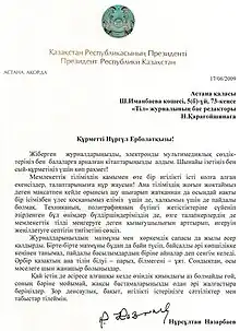 - ↑ "Официальный сайт Президента РК :: КАЗАХСТАН". 5 October 2008. Archived from the original on 5 October 2008.