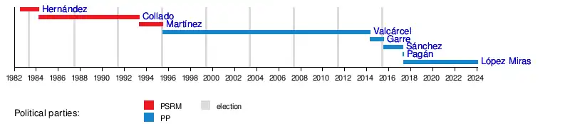 The President of the Region of Murcia, (Spanish: Presidente de la Región de Murcia) is the head of government of the Spanish autonomous community of the Region of Murcia. Since 2014, no person who has been elected to two terms may be elected to a third.[1]