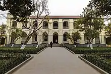 Two cedars were planted in 1934 by Chairman Lin Sen on both sides of the courtyard in the front of the Presidential Building. The cedar on the east side was dead in 2005 and was cut down in 2013.[1] The building was designed by Yu Binglie, who was the head of the department of architecture, National Central University. Inside the house, the first floor was served as the office of the Secretary-General to the President, the highest-ranking official in the Office of the President who supervised the staff of the Office. The presidential office and vice presidential office were both on the second floor. The meeting room of the State Affair Council was located on the third floor.