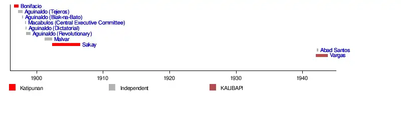 - ↑ Term began when Bonifacio declared the establishment of the Tagalog Republic.