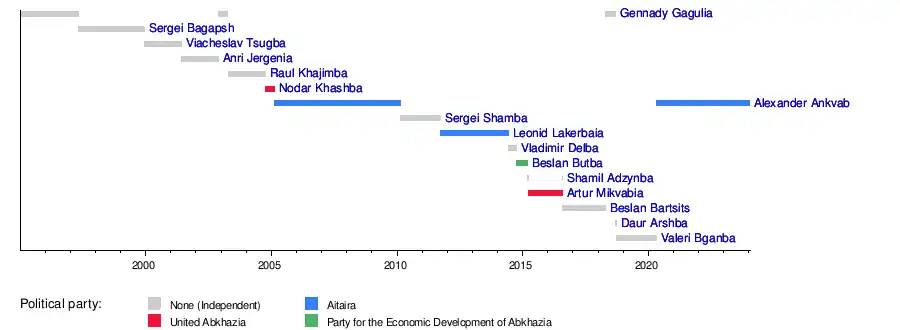 While the presidency was held by one man – Vladislav Ardzinba – from 1994 to 2005, the position of prime minister changed hands a number of times during that time. It was created with the November 1994 adoption of the Constitution of Abkhazia, and Gennady Gagulia was appointed to the position in January 1995.