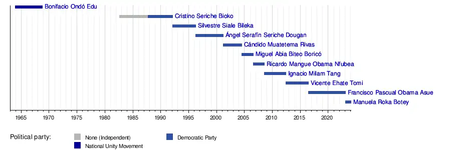 This article lists the prime ministers of Equatorial Guinea, a country in the Gulf of Guinea. The prime minister of Equatorial Guinea is a member of the Council of Ministers, which is chaired by the president. Bonifacio Ondó Edu was the first person to hold the preceding office of prime minister of Spanish Guinea, taking effect on 15 December 1963. The incumbent is Manuela Roka Botey, having taken office on 1 February 2023.