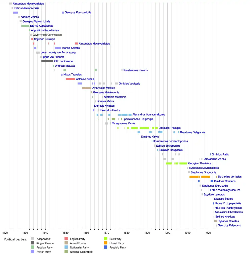 Georgios KafantarisStylianos GonatasSotirios KrokidasAnastasios CharalambisNikolaos TriantafyllakosPetros ProtopapadakisNikolaos StratosSpyridon LambrosNikolaos KalogeropoulosStephanos SkouloudisDimitrios GounarisEleftherios VenizelosStephanos DragoumisKyriakoulis MavromichalisGeorgios TheotokisAlexandros ZaimisDimitrios RallisNikolaos DeligiannisSotirios SotiropoulosKonstantinos KonstantopoulosDimitrios ValvisTheodoros DeligiannisCharilaos TrikoupisThrasyvoulos ZaimisEpameinondas DeligeorgisAlexandros KoumoundourosBenizelos RoufosDiomidis KyriakosZinovios ValvisAristeidis MoraitinisGennaios KolokotronisAthanasios MiaoulisDimitrios VoulgarisAntonios KriezisKitsos TzavelasKonstantinos KanarisAndreas MetaxasOtto of GreeceIgnaz von RudhartJosef Ludwig von ArmanspergIoannis KolettisAlexandros MavrokordatosSpyridon TrikoupisAugustinos KapodistriasIoannis KapodistriasGeorgios MavromichalisAndreas ZaimisGeorgios KountouriotisPetros MavromichalisAlexandros Mavrokordatos