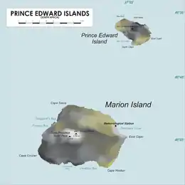 The islands in the group have been declared Special Nature Reserves under the South African Environmental Management: Protected Areas Act, No. 57 of 2003, and activities on the islands are therefore restricted to research and conservation management.[2][3] Further protection was granted when the area was declared a marine protected area in 2013.[4][5] The only human inhabitants of the islands are the staff of a meteorological and biological research station run by the South African National Antarctic Programme on Marion Island.