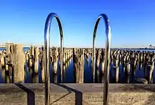 With the containerisation boom the pier became unused, being closed to public access in the early 1990s due to the poor timber condition. Squatters caused a fire in the late 1990s that destroyed the store structures.[2] In the three years to 2004, 14 fires occurred.[1] A refurbishment, estimated to cost $14 million, was announced by the State Government in April 2006, with the first 196 metres of the pier to be fully restored. Beyond that point, the decking was removed and the original pylons preserved. A full restoration was estimated to cost $60 million.[6] A contract for the work was awarded in June 2007,[7] and work began in October of the same year.[8] The refurbished section of the pier reopened to the public in December 2011.