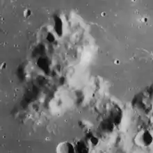 Promonontorium Kelvin, a small mountain range narrowly connected to Rupes Kelvin. Lunar Orbiter 4 photo.