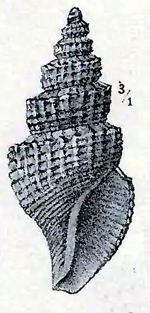 The white shell has an ovate-fusiform shape and is clathrate. It contains 6 whorls. The longitudinal ribs are eminently pronounced and are crossed by transverse plicae.[2]