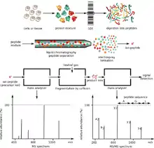 Protein mass spectrometry refers to the application of mass spectrometry to the study of proteins. Mass spectrometry is an important method for the accurate mass determination and characterization of proteins, and a variety of methods and instrumentations have been developed for its many uses. Its applications include the identification of proteins and their post-translational modifications, the elucidation of protein complexes, their subunits and functional interactions, as well as the global measurement of proteins in proteomics. It can also be used to localize proteins to the various organelles, and determine the interactions between different proteins as well as with membrane lipids.[1][2]