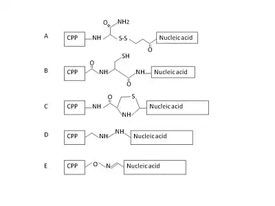 Most CPP-nucleic acid complexes that have been proposed so far are formed through covalent bonding. A range of CPP-nucleic acid complexes have been synthesized through different chemistries that are either stable or cleavable linkages. And the most widely used method in publication is cleavable disulfide linkages through total stepwise solid-phase synthesis or solution-phase or solid-phase fragment coupling.[33] Some other strategies like stable amide, thiazolidine, oxime and hydrazine linkage have also been developed.[34] However, those covalent linking methods are limited by the concern that the synthetic covalent bond between CPP and nucleic acid may alter the biological activity of the latter.[35] Thus, a new non-covalent strategy requiring no chemical modification with short amphipathic CPPs, like MPG and Pep-1 as carriers has been successfully applied for delivery of cargoes.[36][37] These non-covalent conjugates are formed through either electrostatic or hydrophobic interactions. With this method, cargoes such as nucleic acids and proteins could be efficiently delivered while maintaining full biological activity.