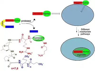 - ↑ Jiang T, Olson ES, Nguyen QT, Roy M, Jennings PA, Tsien RY (December 2004). "Tumor imaging by means of proteolytic activation of cell-penetrating peptides". Proceedings of the National Academy of Sciences of the United States of America. 101 (51): 17867–72. Bibcode:2004PNAS..10117867J. doi:10.1073/pnas.0408191101. PMC 539314. PMID 15601762.