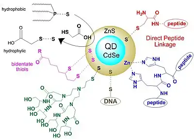 - ↑ Delehanty JB, Medintz IL, Pons T, Brunel FM, Dawson PE, Mattoussi H (2006). "Self-assembled quantum dot-peptide bioconjugates for selective intracellular delivery". Bioconjugate Chemistry. 17 (4): 920–7. doi:10.1021/bc060044i. PMC 2519024. PMID 16848398.