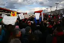 People and organizations in Detroit organized a protest on January 29 at the Metropolitan Airport which drew an estimated 2,500 prostestors.[82][83] Hundreds turned out in protests in the nearby suburbs of Dearborn and Hamtramck, which have significant Muslim American and immigrant populations.[83] Protesters demonstrated as snow fell and the Detroit Free Press reported that their voices "could be above the roar of jet engines."[84] The airport's Authority Public Safety team coordinated with protest organizers to ensure the protest would be safe and that the demonstrators could be heard. No one was arrested.[85]