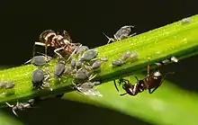 A further example of protocooperation is the connection between ants and aphids. The ant searches for food on trees and shrubs that are hosts to honeydew-secreting species such as aphids, mealybugs, and some scales. The ant gathers the sugary substance and takes it to its nest as food for its offspring. It has been known for the ant to stimulate the aphid to secrete honeydew straight into its mouth. Some ant species even look after the honeydew producers from natural predators. In areas where the ant inhabited the same ecosystem as the aphid, the plants they inhabit normally suffer from a higher presence of aphids which is detrimental to the plant but not to the two species protocooperating.