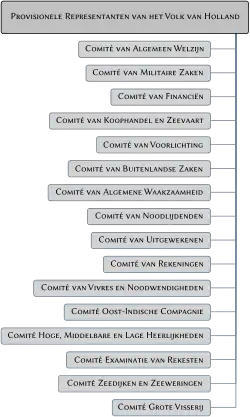 Each of the represented entities[note 7] was entitled to four representatives, though sometimes less were sent. The assembly was made up of a number of standing committees that were responsible for tasks that were delegated to them. The primus interpares was the Comité van Algemeen Welzijn (Committee of General Welfare, which was clearly inspired by the French Committee of Public Safety).[note 8] In a demonstration of constitutional continuity this committee worked according to the 1751 Instruction for the Gecommitteerde Raden (Executive) of the old States of Holland. The committees remained active until the newly elected National Assembly came into being in April 1796.[5]