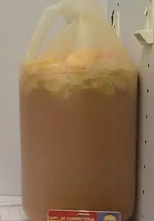 A one-US-gallon (3.8 L) jug of contraband prison wine made from oranges, confiscated from an inmate