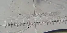 The asci are roughly cylindrical with a long stem-like base; the entire ascus is often as long as 300–325 µm and about 15 µm in diameter at the thickest point. The spores are round, smooth, translucent (hyaline), and have diameters of about 12–14 µm.[8] They are filled with many small oil droplets.[9] The paraphyses (sterile filamentous hyphae in the hymenium) are enlarged at their tips and filled with brown colored matter, about 4 µm thick.[8]