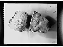 Originally, Sepkoski (2002) suggested the possibility of the problematic fossils as being a Jellyfish.[1] Although a more modern and updated interpretation of P. howchini is it being a pseudo-fossil or a structure caused by the Holdfast of a Petalonamid being pulled out by the currents. Pseudorhizostomites tends to occur around very thin impressions and casts of fossils which are the likely producer of Pseudorhizostomites if they decayed.[3] The decayed parts of the organisms preserved alongside the biogenic structure were also interpreted as escaping through an overlying sand lamina.[4] The species Rugoconites tenuirugosus was thought to be the originator behind P. howchini ; the fossil was also compared with the living Hydrozoan Campanularia.[4]