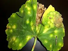 | Rust pustules on the underside of a geranium leaf | |