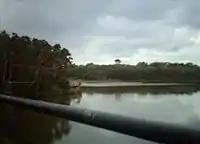From the entrance sign another track forms. This one goes to the beach to the east, and several minor tracks branch from it to history plaques, picnic areas and seats, including a seat under a prominent pine at the lagoon edge from where views of Wollongong can be had, and the sites of Puckey's constructions and the remnants of his house and saltworks. This area has two prominent pines which can be seen from North Wollongong.