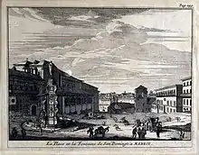 Located in the northern end of the city by the 16th century, near the Walls of Philip II, the square became a key point for the traffic arriving to Madrid from El Pardo or from Fuencarral.[2] The huge convent of Santo Domingo covered an area going along the cuesta de Santo Domingo, extending from the plaza de Santo Domingo to the plaza de Isabel II.[3] The square gained its current size after the demolition of the convent during the 19th-century ecclesiastical confiscations.[4]