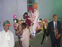 Ghodi Chadna is the final ceremony at the groom's place. The groom's sisters and cousins feed and adorn his mare. To ward off the evil eye, people use cash and perform the Varna ritual. The cash is then distributed among the poor. After this the boy climbs the horse and leaves his home for the wedding venue.