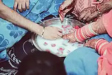 Reception at the boy's house: The newlyweds are welcomed in a ceremony called the pani bharna. Then the bride must, with her right foot, kick the sarson ka tel (mustard oil) that is put on the sides of the entrance door before she enters the house. Then, along with her husband, she must offer puja in their room. Then they must touch the feet of the elders in a ceremony called matha tekna. The rest of the evening is spent playing traditional games.