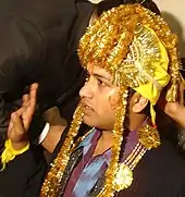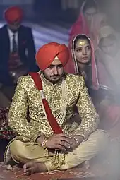 Sehra: Like the bride's home, the Vatna and Ghara Gharoli are followed by the dressing up of the groom in his wedding attire. After the groom has dressed up in his wedding clothes, a puja is performed. Thereafter, the groom's sister ties the sehra on the groom's head. After the completion of Sehrabandi ceremony, all those who witness the function give gifts and cash to the boy as a token of good luck.