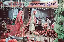 In a Sikh wedding, the bride and groom will walk in tow around the Guru Granth Sahib four times, called laavaan. This signifies they not only vow to see each other as one soul in two bodies, the ideal in Sikh marriage, but also as the Guru as the center of their marriage. Sikhs do not do pujas during any part of the marriage ceremony.