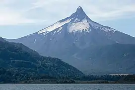 Puntiagudo-Cordón Cenizos (Spanish pronunciation: [puntjaˈɣuðo koɾˈðon seˈnisos]) is a snow-capped volcanic chain located in the Andes, in Los Lagos Region of Chile, near Volcán Osorno. It lies between Rupanco Lake and Todos los Santos Lake. "Volcán Puntiagudo" (Spanish for "Sharp-pointed volcano") is a stratovolcano with a prominent 2,493 m high sharp-pointed summit that results from glacial dissection and gets its name from this feature. According to locals, the Puntiagudo volcano lost some of its sharp point in the earthquake of 1960 (9.4–9.6 Mw). So the volcano was more pointed than it is today. Puntiagudo is also given the name Cerro Cenizas.