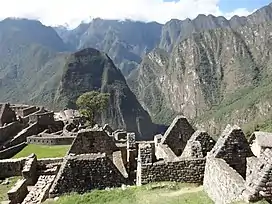 ![]() Putucusi (center-left) behind the ruins of Machu Picchu | |