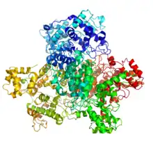 Pyruvate dehydrogenase E1 subunit of E. coli. Colors represent different chains. Structure determined by Arjunan et al. Biochemistry 2002. Created with PyMol.