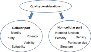 Careful and detailed documentation concerning the characteristics of the starting materials (e.g. history of the cell line derivation and cell banking) and manufacturing process steps (e.g. procurement of tissue or cells and manipulation) must be maintained. The cellular part of every cell-based medicinal product must be characterized in terms of identity, purity, potency, viability and suitability for the intended use. The non-cellular constituents must be also characterized with regards to their intended function in the final product. For example, scaffolds or membranes that are used to support the cells must be identified and characterized in terms of porosity, density, microscopic structure and particular size. The same requirement for characterization applies for biologically active molecules, such as growth factors or cytokines.[5]
