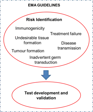 When quality control of TEMPs is considered, a risk assessment needs to be conducted. A risk is defined as a "potentially unfavourable effect that can be attributed to the clinical use of advanced therapy medicinal products (ATMPs) and is of concern to the patient and/or to other populations (e.g. caregivers and off-spring)".[3] Some risks include immunogenicity, disease transmission, tumor formation, treatment failure, undesirable tissue formation, and inadvertent germ transduction. A risk factor is defined as a "qualitative or quantitative characteristic that contributes to a specific risk following handling and/or administration of an ATMP".[3] The integration of all available information on risks and risk factors is called risk profiling. Due to the fact that every TEMP is different, the risks associated with each one of them vary and, subsequently, the procedures that must be implemented to ensure its quality are also unique to the product. Once the risks associated with the TEMP are identified, the appropriate tests must be developed and validated accordingly. Thus, there is no standard set of tests for the quality control of TEMPs. The EMA has released a set of regulatory guidelines on the topics to be considered by companies involved in the development and marketing of medicines for use in the European Union.[3][4][5][6] These guidelines have to be followed in order for the marketing authorization of a product to be issued. Fictitious examples of risk analysis for further elucidation of the process are provided in the EMA guidelines.[3]