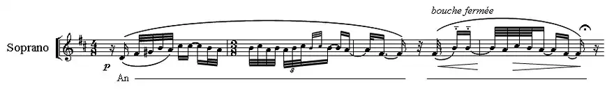 "Lahore" stands out from the other mélodies, lasting nearly four minutes. The Heine poem,subtly ironic in its parallel of the fir numbed with cold and the palm under the burning sun, allows Delage to evoke the Far East with luxurious arpeggios on the harp. The end of the poem opens on a very pure, unaccompanied vocalization (bars 43 to 55 in the score) in which the singer must adjust her tessitura and sing à bouche fermée ("with mouth closed"), then bouche ouverte ("mouth open"), "closing the mouth bit by bit". This novel effect stunned its first audiences.[19]
